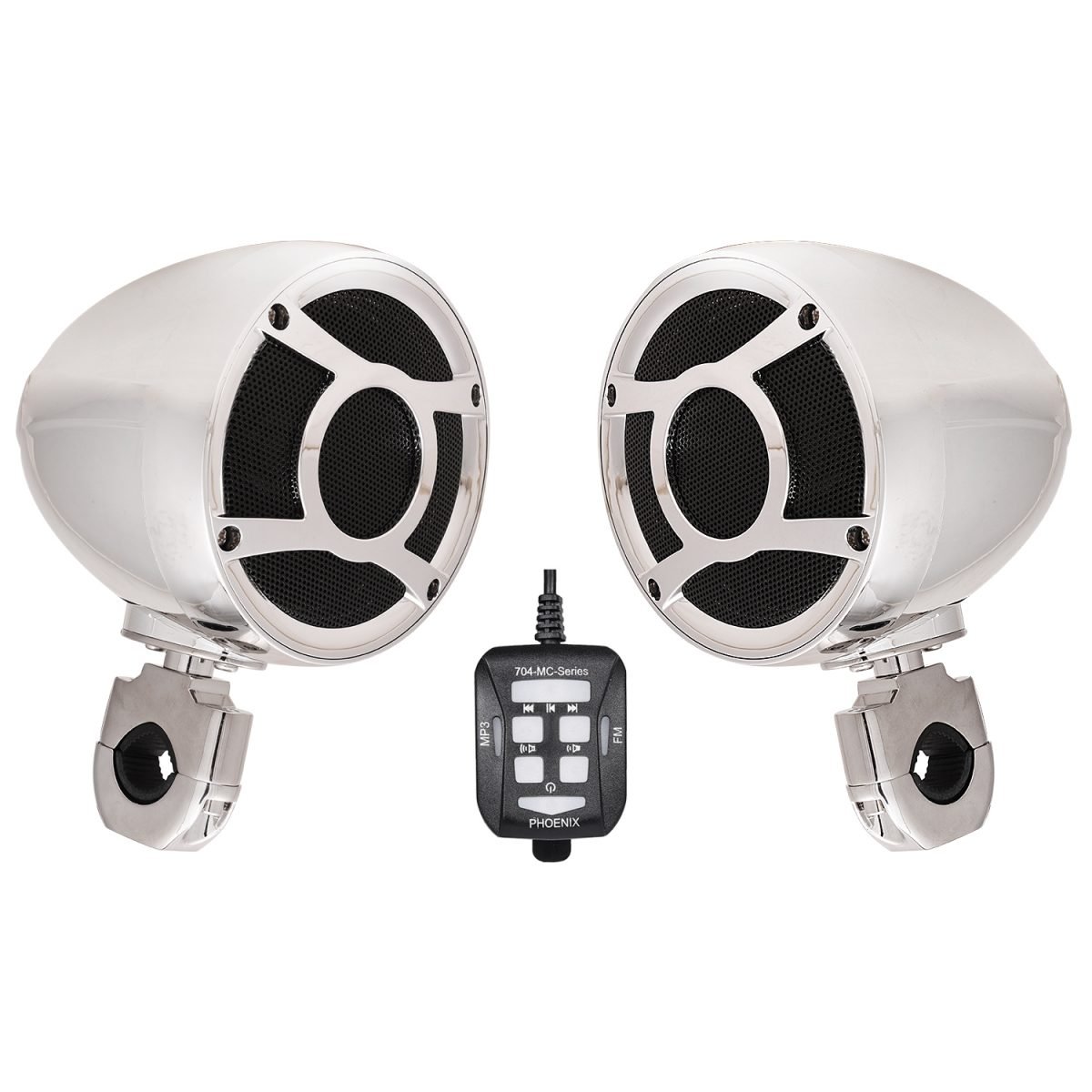PAGARIA Waterproof Bike Music System for Cruisers with FM, Bluetooth, USB, 80W Speakers, Model: 280098DA Chrome